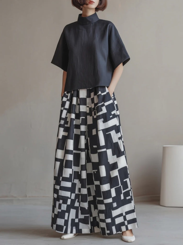 High-Neck Top & Abstract Print Wide-Leg Skirt Set