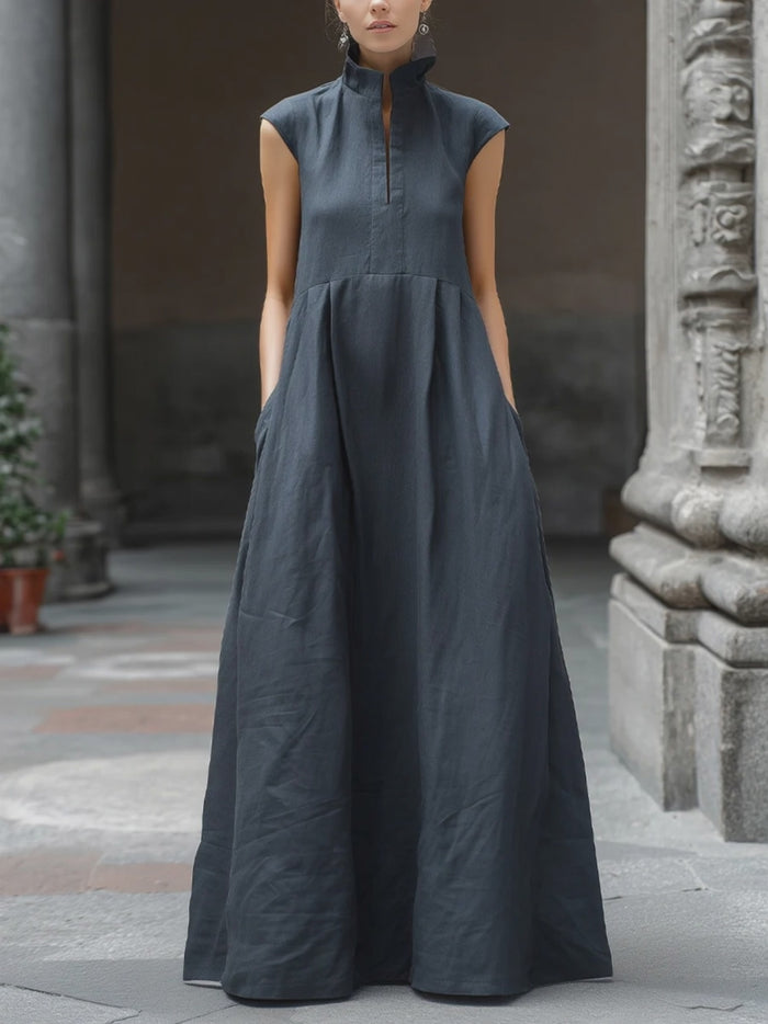High-Neck Denim Maxi Dress With Sculpted Volume
