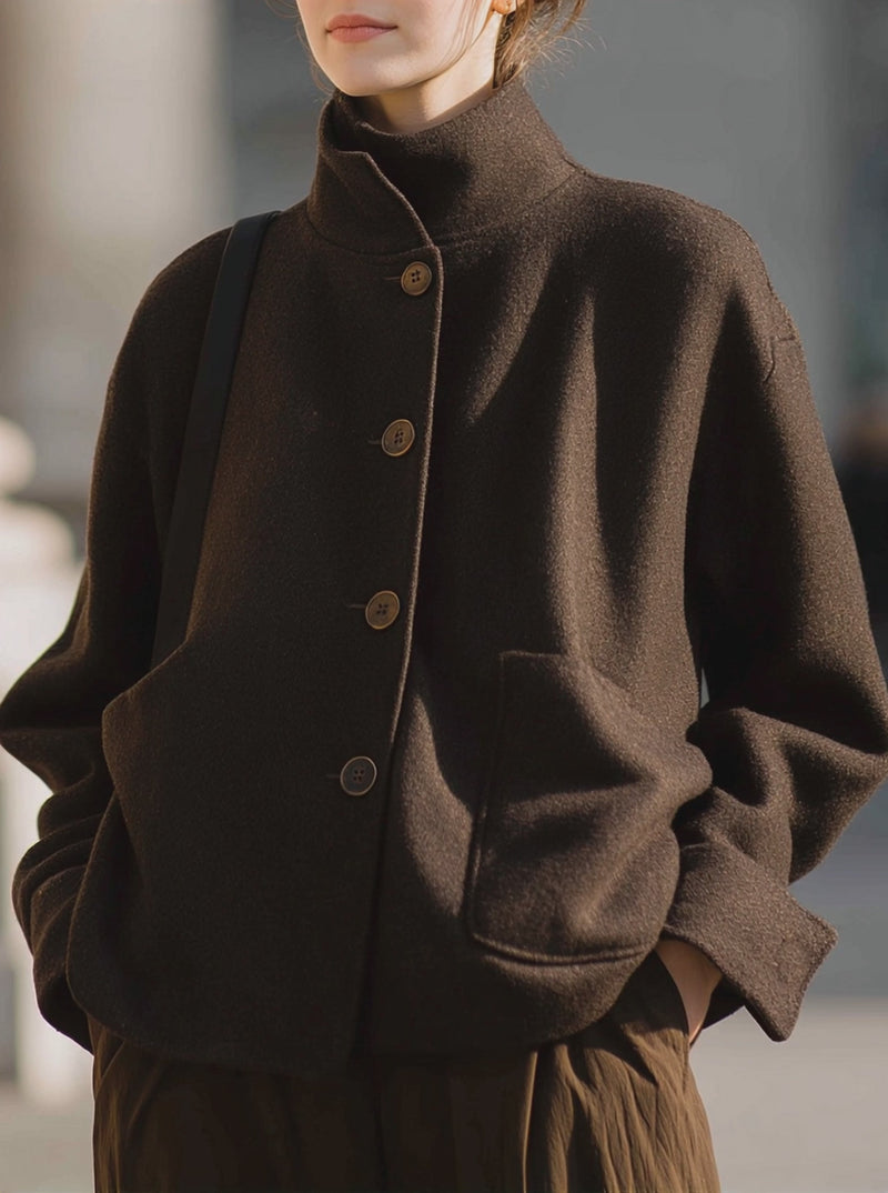 Introduces the Minimalist Brown Wool Stand-Collar Jacket, a refined outerwear piece designed for effortless sophistication. Crafted from premium wool, this jacket combines warmth with clean, structured design. The high stand collar creates a modern edge, while the asymmetrical button closure adds visual interest. Oversized patch pockets provide functionality without compromising elegance, and buttoned cuffs complete the polished detailing.