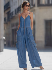 - Design: Slim shoulder straps, V-neckline, front zipper closure, defined waist seam, patch and cargo flap pockets, wide-leg silhouette