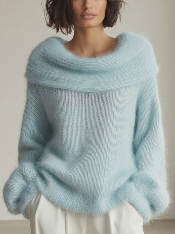 Off-Shoulder Plush Knit Sweater With Folded Collar