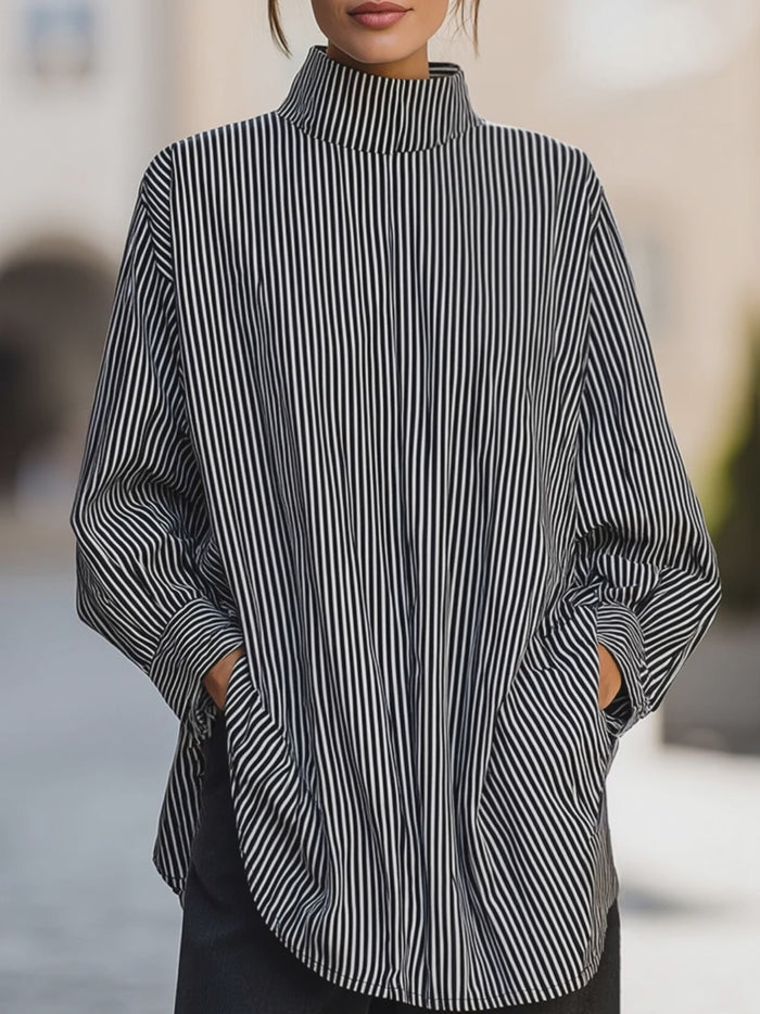 Black & White Vertical Stripe High-Neck Blouse